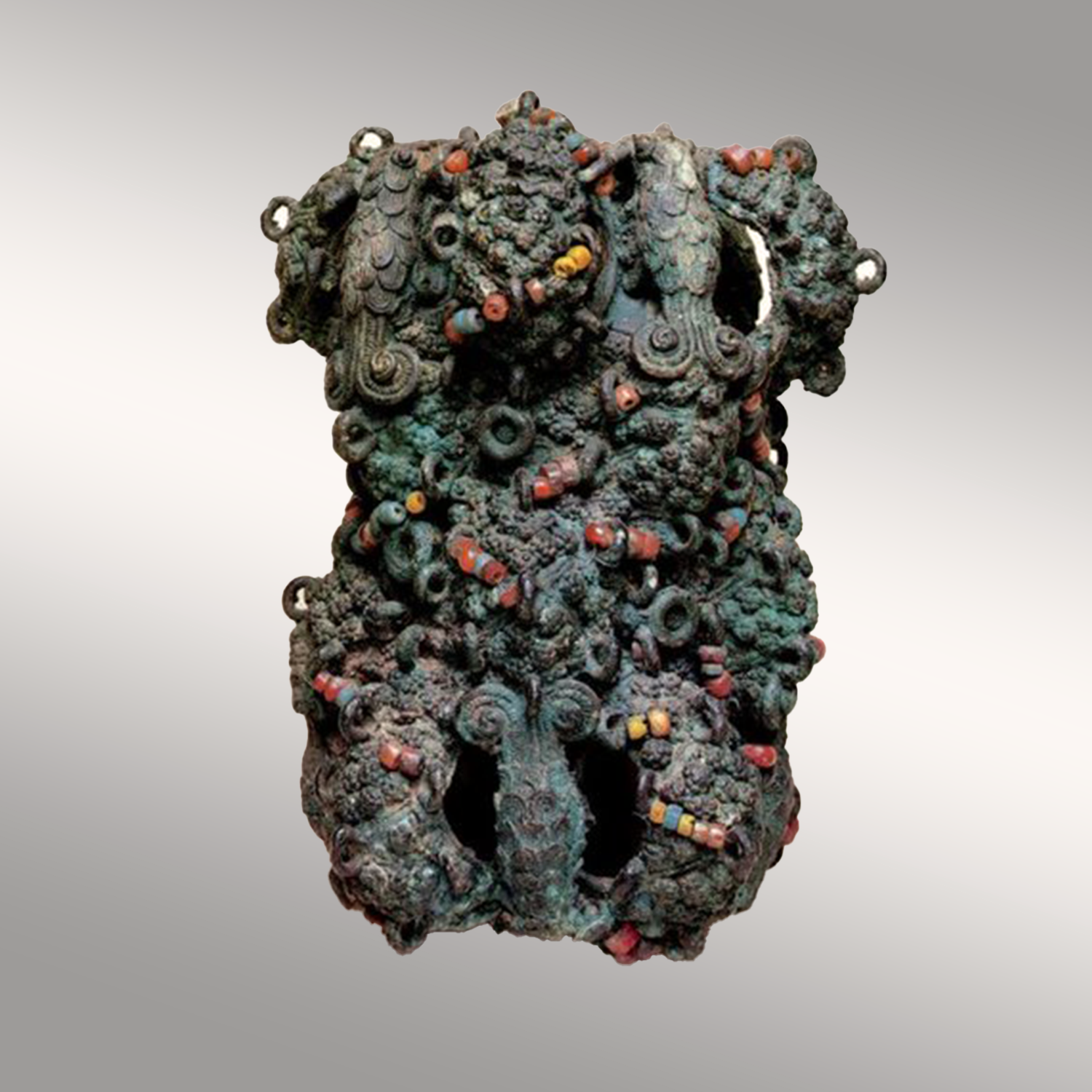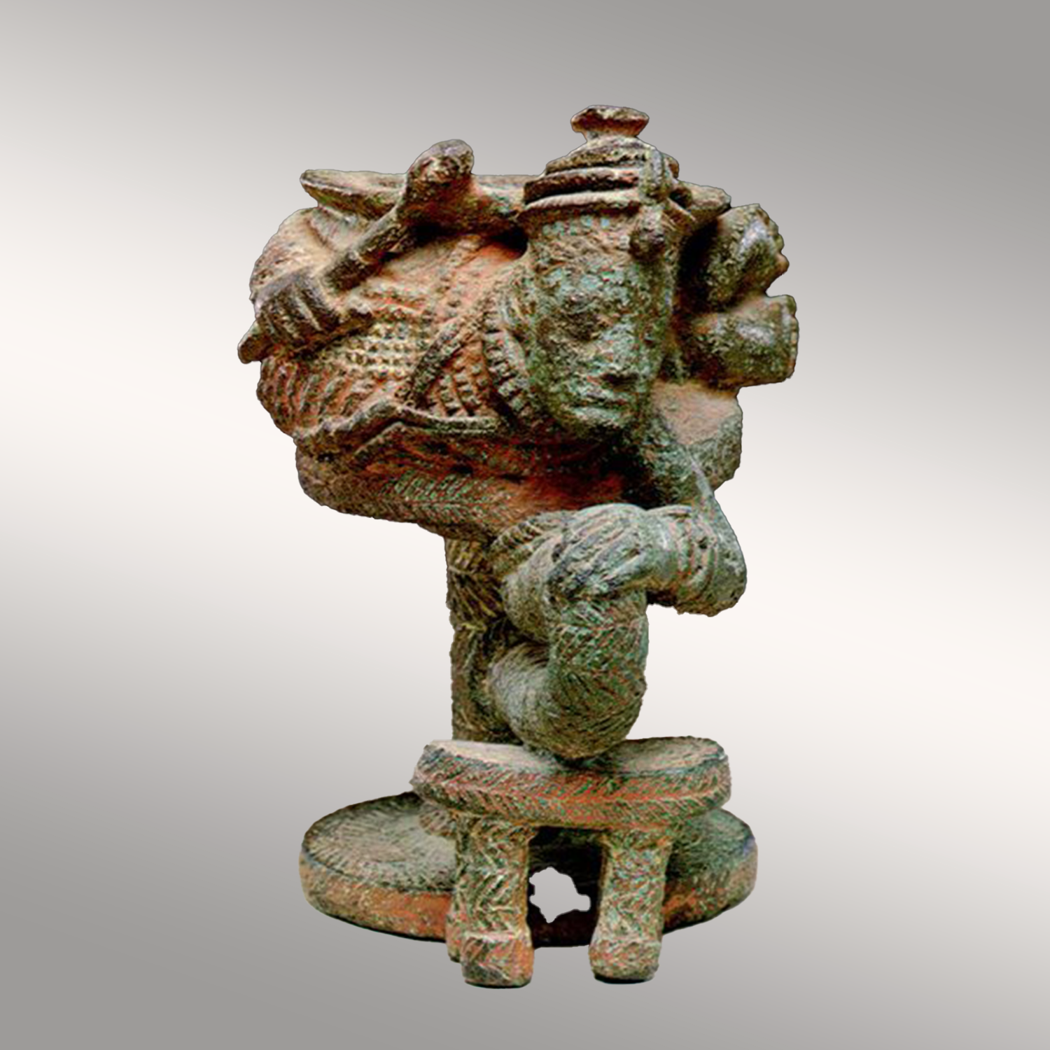 Some of the bigger and more complex bronzes, like the Bronze Roped Pot, were not cast in one piece, they were cast in combination of processes. These procedures reveal the complexity in such molding, which is described elaborately by Thurstan Shaw in his work: Unearthing Igbo-Ukwu. From this description as well, it is realized that in the lost wax method, each can only be used once resulting in the uniqueness of each casting. The complexity of the designs and pattern used in decorating these items were immense and unique in character and over 63,200 beads were found in Isaiah’s compound, many of them lying in rows. Among the findings were also spiral snake ornaments which consist of a square sectioned spike of copper running through a spirally coiled length copper and which terminate in the snake’s head, holding an egg in its mouth. These decorations were not made by being molded in wax before casting, but were achieved with a sharp-ended punch hammered into cold metal. It is remarkable that analysis has shown that objects from Igbo-Ukwu made in this fashion are composed of almost pure copper, while the objects made by the wax casting process are composed of bronze. What is interesting about this is the indication it gives to us of the metallurgical knowledge of the craftsmen who made the metal objects of Igbo-Ukwu. Copper can be bent, twisted, inscribed and have designs punched into it in a cold state much more easily than bronze, while bronze flows more easily when molten and is better for casting than copper. This is an indication that the Igbo-Ukwu metallurgists were scientific enough to understand these properties, and as such, knew what they were doing.